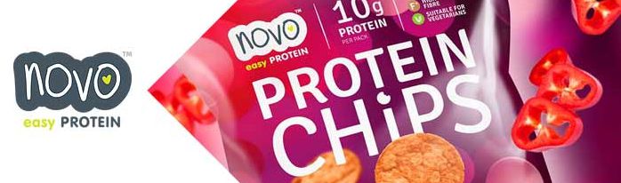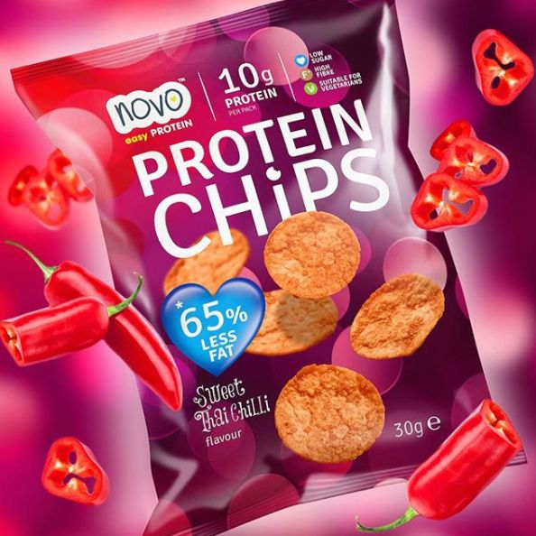 Protein Chips de Novo Easy Protein son unos deliciosos chips saludables, altos en proteínas y bajos en grasas que se presentan en bolsas individuales de 30 gramos con sabor a crema agría y cebolla, chili dulce tailandes o barbacoa.