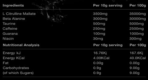 - Extremadamente potente, contiene 3,5 g de citrulina malato y 3 g de beta alanina.