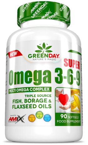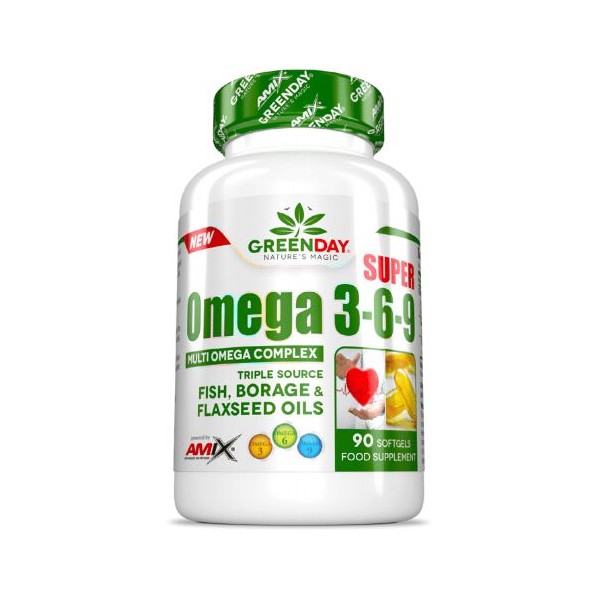 GreenDay® Super Omega 3-6-9 de Amix es un suplemento en perlas que proporciona 1.000 mg de ácidos grasos insaturados omega 3-6-9 procedentes de tres fuentes diferentes (aceite de pescado, aceite de borraja (Borago officinalis) y aceite de lino) por dosis de 1 perla.