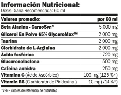 Agua purificada, beta alanina (Carnosyn®), glicerol en polvo GlyceroMax® 65%, taurina, clorhidrato de L-arginina, acidulante (E338 ácido fosfórico), glucuronolactona, cafeína anhidra, ácido ascórbico (vitamina C), conservantes (E202 sorbato potásico, E211 benzoato sódico), aroma, edulcorante (E955 sucralosa), colorante (E150 caramelo), clorhidrato de piridoxina (vitamina B6).