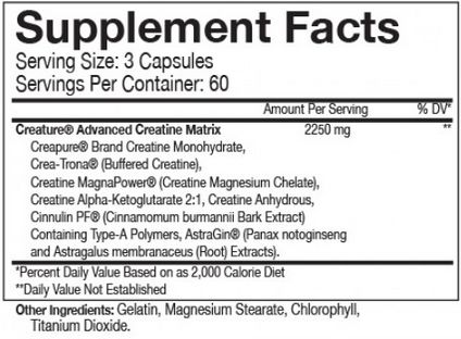 Matriz de creatina avanzada Creature® (Creapure® (Monohidrato de creatina), Crea-Trona® (creatina neutralizada), Creatine MagnaPower®, Creatina alfacetoglutarato, Creatina anhidra, Cinnulin PF® (extracto de Cinnamomum burmanii estandarizado para polímeros de tipo A) AstraGin™ (Panax notoginseng – Astragulus membranaceous)).