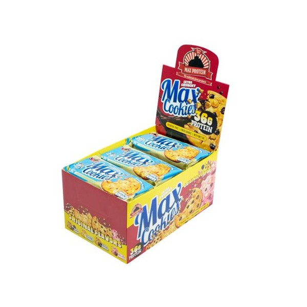 Max Cookies de Max Protein son unas deliciosas galletas de 25 gramos con el sabor de la auténtica galleta americana, altas en proteína que suponen una fantástica alternativa a las barritas y batidos de proteína y que podrás disfrutar en 4 deliciosas versiones de galleta con chocolate con coco, galleta con chocolate negro, galleta con choclate blanco y galleta pink & White.