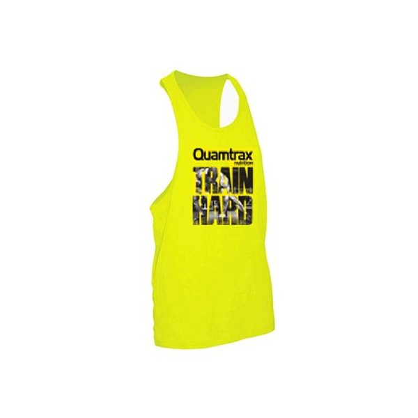 Fabricada en color amarillo con el icónico diseño de Train Hard de la marca Quamtrax Nutrition que gustará a cualquier aficionado al culturismo. Dispone de un corte perfecto que se ajusta a los hombros para que puedas realzar tu musculatura. El complemento ideal para realizar los entrenamientos más intensos.