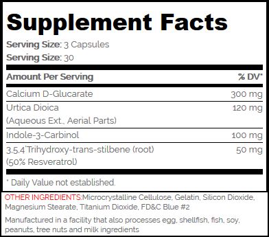 Calcio D-glucarato, Urtica dioica - 120 mg (Extracto acuoso de las partes aéreas), Di-indolil metano (DIM), 3,5,4'-trihidroxi-trans-estilbeno - 50 mg (20% de resveratrol y 10% de emodín).