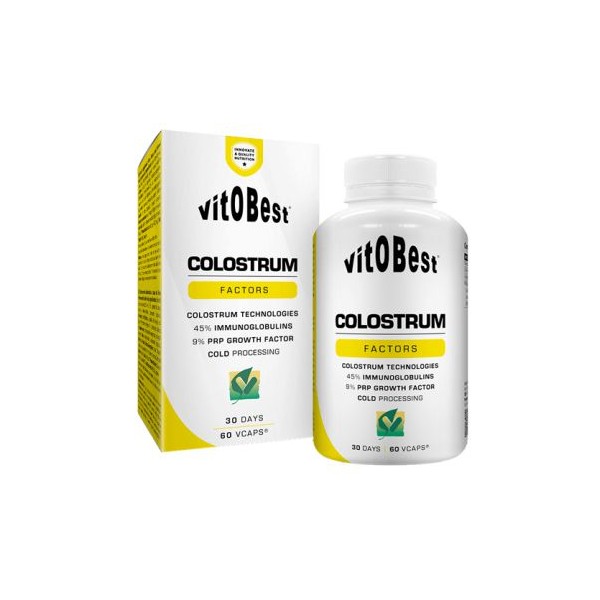 Colostrum Factors de Vitobest es un suplemento deportivo en cápsulas vegetales elaborado con 500 mg de calostro Colexan®, potenciado con ornitina, arginina y una mezcla de probióticos que ha sido diseñado para mejorar tu sistema inmunológico, el equilibrio hormonal y optimizar la recuperación del tejido muscular.