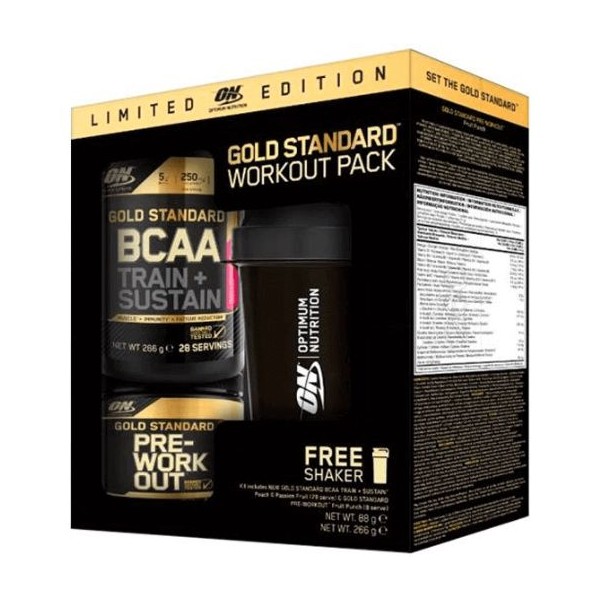 Gold Standard Workout Pack de Optimum Nutrition es un paquete edición limitada que incluye una unidad de BCAA Train + Sustain sabor Peach and Passion Fruit de 28 servicios, una unidad de Gold Standard Pre-Workout sabor Fruit Fusion de 8 servicios y un Shaker de 600 ml.