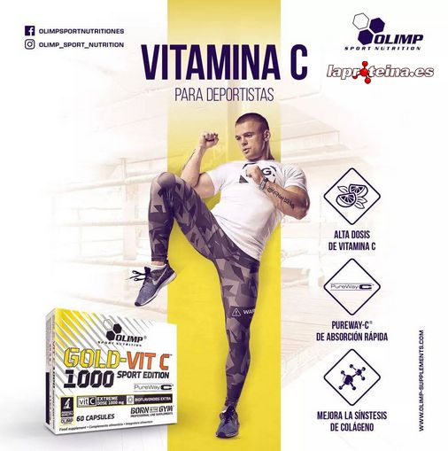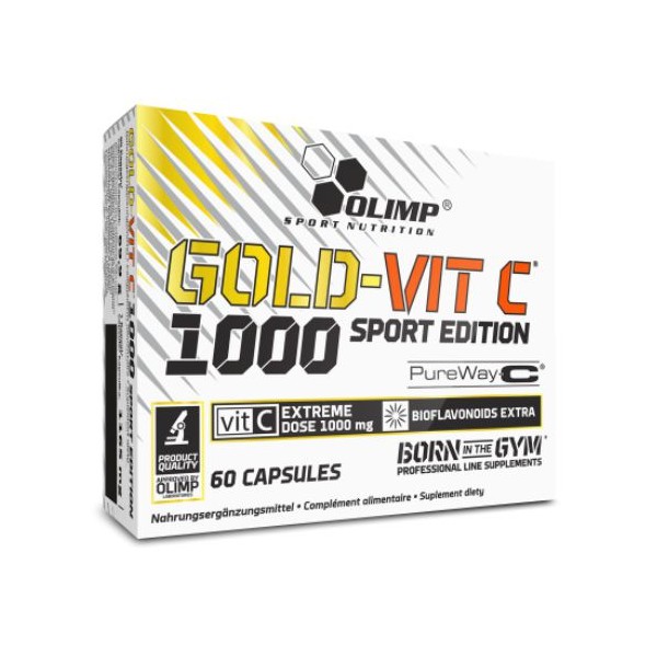 Gold-Vit C 1000 Sport Edition de Olimp Sport Nutrition es un suplemento en cápsulas que proporciona 1.000 mg de PureWay-C® una forma de vitamina C (ácido L-ascórbico y bioflavonoides cítricos) que se absorbe mejor, tiene mayor disponibilidad y es más eficaz que la vitamina C convencional.