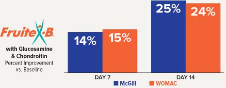 Un estudio doble ciego, controlado con placebo, examinó los efectos de FruiteX-B® en la salud de las articulaciones e incluyó los cuestionarios WOMAC y McGill, muy utilizados, que miden la comodidad y el dolor de las articulaciones. Los sujetos que tomaron FruiteX-B® durante catorce días, mostraron una mejora del 29% en las puntuaciones WOMAC y una mejora del 27% en las puntuaciones McGill. FruiteX-B® también redujo los niveles séricos del marcador inflamatorio general Proteína C-reactiva.
