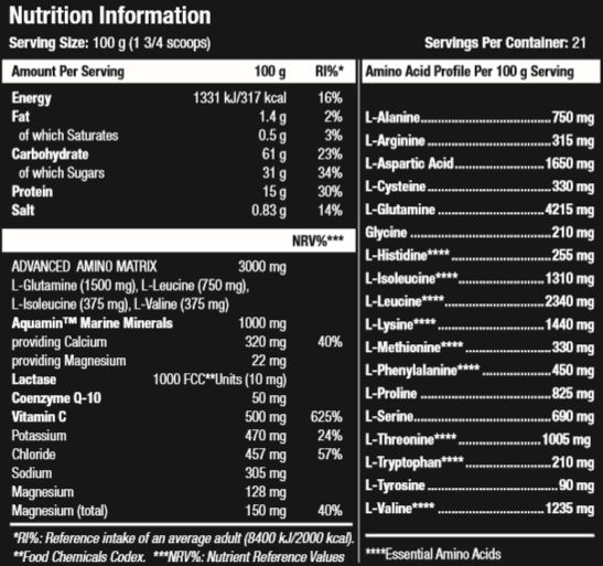 Sabor vainilla: Maltodextrina, dextrosa, concentrado de proteína de suero (de leche, instantanizado con lecitina de soja), aroma (vainilla, limón), fructosa, Palatinose™, isomaltulosa, queso quark en polvo (de leche), gluconato de potasio, L-glutaminas, Aquamin™ (Lithothamnium calcareum complejo único multimineral marino que proporciona calcio y magnesio bioactivo), citrato de trimagnesio anhidro, cloruro de sodio, L-leucina, ácido L-ascórbico (vitamina C), espesante (goma xantana), L-isoleucina, L-valina, edulcorantes (sucralosa, acesulfamo-K), coenzima Q-10, betagalactosidasa microgranulada (Tolerase™ L-lactasa).