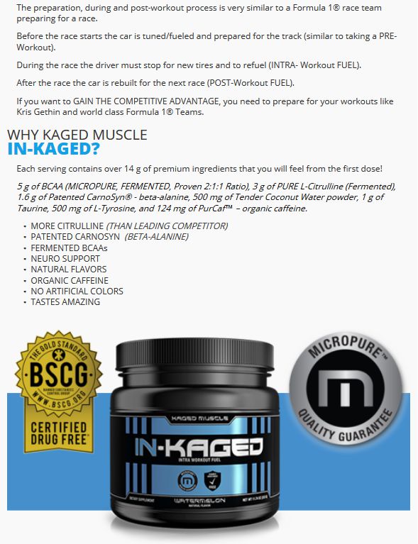 In-Kaged de Kaged Muscle es un suplemento en polvo que contiene una fórmula para tomar durante el entrenamiento diseñada para ayudarte a mejorar el rendimiento durante tu entrenamiento, ofrecerte unos bombeos musculares extremos, mejorar la fuerza y la resistencia, y proporcionarte una energía imparable.
