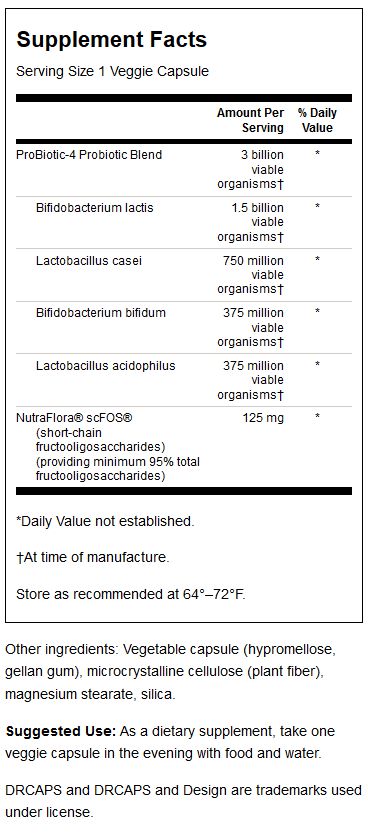 ProBiotic-4 de Swanson es un nuevo y exclusivo probiótico de amplio espectro en cápsulas vegetales que proporciona 3 mil millones de organismos viables de bacterias beneficiosas de cuatro cepas seleccionadas, entre las que se incluyen Bifidobacterium lactis, Lactobacillus casei, Lactobacillus acidophilus y Bifidobacterium bifidum.