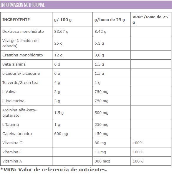 Inulina (33.7%), almidón de cebada Vitargo® (25%), Creatina monohidrato (12%), Beta alanina (6%), L-leucina (6%), Té verde extracto seco (4%), L-Leucina (3%), L-Valina (3%), Arginina Alfa-ketoglutarato (2%), L-Taurina (1%), Cafeína anhidra (0.6 %), Vitamina C, Vitamina A, Vitamina E, Aromas (limón), Acidulante (ácido cítrico), Antiaglomerante (Dióxido de silicio), Edulcorante (sucralosa).