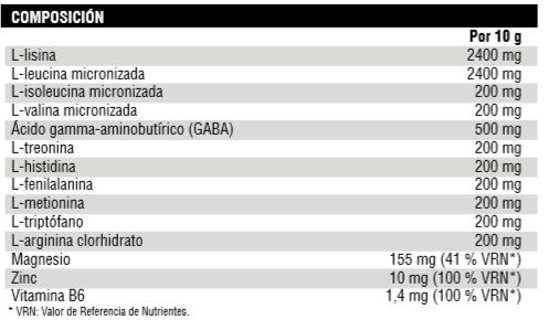 L-lisina clorhidrato, L-leucina micronizada, citrato de magnesio, dextrosa, ácido gamma-amino-butírico (GABA), acidulante (ácido cítrico), L-valina micronizada, L-isoleucina micronizada, L-treonina, L-metionina, L-fenilalanina, L-arginina clorhidrato, L-histidina, L-triptófano, aromas, antiaglomerante (dióxido de silicio), edulcorantes (sucralosa y sacarina), picolinato de zinc, vitamina B6 (clorhidrato de piridoxina) y colorante (tartrazina).