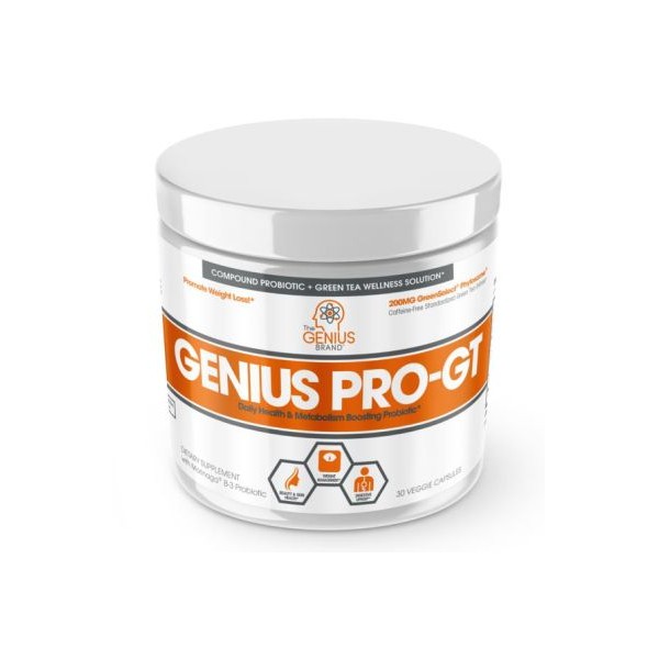 Genius Pro-GT de The Genius Brand es un suplemento en cápsulas que contiene una forma de vanguardia de té verde (GreenSelect® green tea Phytosome®) que ha sido probado científicamente para estimular el metabolismo, además de ser rico en antioxidantes que combaten los radicales libres para promover una mejor salud y bienestar en general; en combinación con una forma especial de probiótico (Morinaga® B3) que puede ayudar a mejorar la eficiencia del sistema digestivo y apoyar una mejor descomposición de los nutrientes a la vez que ayuda a combatir las flatulencias y la hinchazón digestiva.