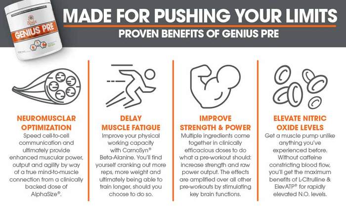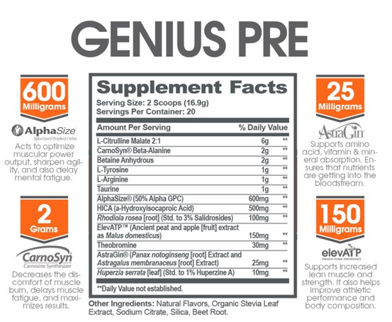 Genius Pre de The Genius Brand es un suplemento en polvo diseñado para mejorar el rendimiento durante el entrenamiento que contiene una matriz sinérgica clínicamente estudiada, que incluye AlphaSize, citrulina malato y CarnoSyn beta alanina, para aumentar la producción de óxido nítrico, aumentar el flujo sanguíneo y reforzar la conexión mente-músculo para poder entrenar con mayor intensidad y durante más tiempo.