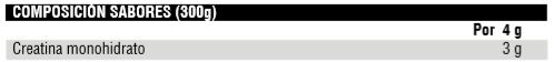 Sabor piña-mango: creatina monohidrato, dextrosa, aromas, acidulante (ácido cítrico), edulcorantes (sucralosa y sacarina) y colorante (tartrazina).