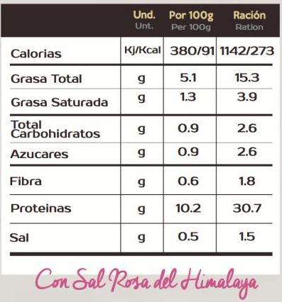 Con una cantidad de carbohidratos muy reducida, alto en proteínas de calidad y con un contenido reducido en sal (únicamente Sal Rosa del Himalaya) este menú promueve el crecimiento y el mantenimiento de la masa muscular. Esta comida saludable contiene 30 gramos de proteína (carne blanca, una de las más magras y libres de grasa), sólo 2, 6 gramos de hidratos de carbono, únicamente 3,9 gramos de grasa saturada y de bajo contenido en sal, tan sólo 1,5 gramos (Sal del Himalaya).