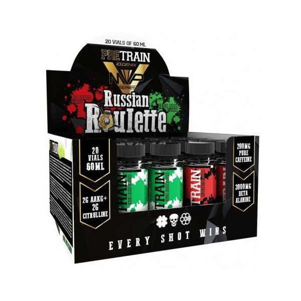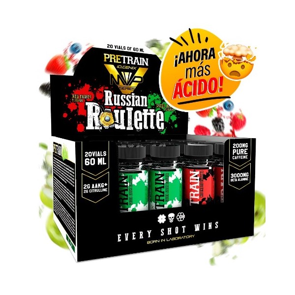 Russian Roulette de IO.Genix es un suplemento en viales individuales líquidos que contiene una fórmula de pre-entrenamiento de rápida acción diseñada para encender tu entrenamiento incrementando los niveles de energía, mejorar la fuerza, la resistencia y la intensidad durante el entrenamiento.