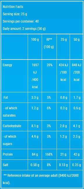 - Contiene exclusivamente aislado de proteína de suero de leche de primera calidad.