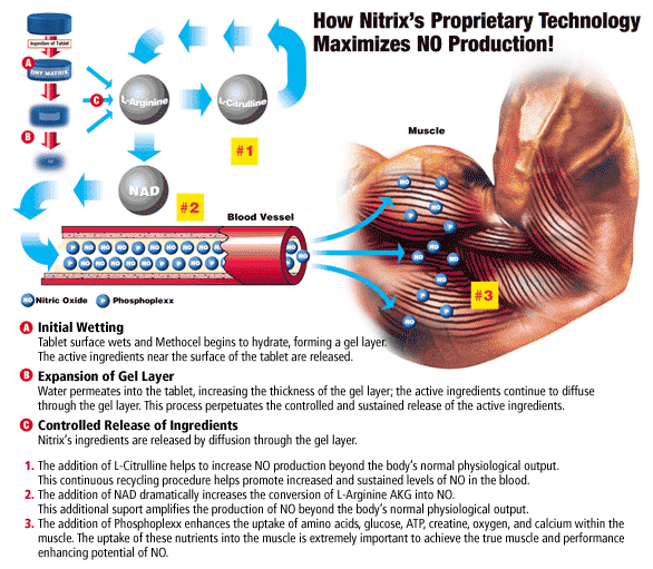 Una de las claves de la fórmula de Nitrix® es su exclusiva matriz ACE (Triple Action Nitric Oxide Matrix) que incluye el aminoácido arginina en forma Alfa Cetoglutarato y en forma de L-Arginina Etil Ester que junto con la L-Citrulina, son unos potentes precursores del óxido nítrico. Se sabe que los niveles elevados de óxido nítrico dilatan los vasos sanguíneos, lo que ejerce una gran variedad de efectos positivos sobre el rendimiento y el aspecto de los músculos.
