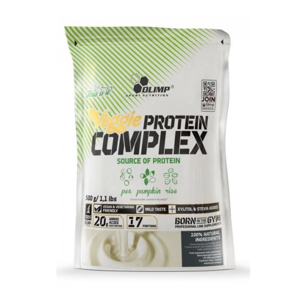 Veggie Protein Complex de Olimp® Sport Nutrition es un suplemento en polvo que contiene una mezcla de proteínas vegetales concentradas (proteína de guisante, proteína de arroz integral, proteína de semillas de calabaza) que está disponible en dos versiones, una con sabor a chocolate y otra con sabor natural.