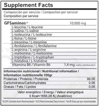 Además GFS Aminos es una fórmula 100% natural, y no requiere de refrigeración ni ningún tratamiento especial.
