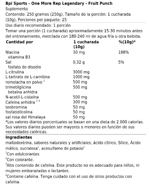 Precaución: One More Rep™ Legendary contiene vitamina B3 (niacina). La niacina puede causar un enrojecimiento temporal, hormigueo, enrojecimiento de la piel y sensaciones de calor, especialmente si se toma con el estómago vacío. Esto es una reacción normal que no tiene porque preocuparte.