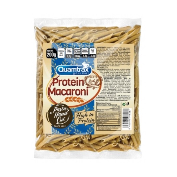 Protein Macaroni de Quamtrax Gourmet son unos macarrones de pasta elaborados a base de una mezcla de proteínas, harina de trigo integral, harina de soja, proteína de arroz y fibra de avena.