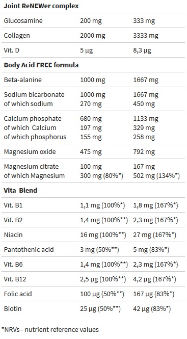 La adecuada regeneración del tejido conectivo después del entrenamiento es muy importante, por eso Regenerator ha sido adicionalmente enriquecido con una alta dosis de colágeno, glucosamina y vitamina D. Estos compuestos ayudan a la regeneración de las micro-lesiones en las estructuras articulares, ligamentos y tendones después de un entrenamiento intenso.