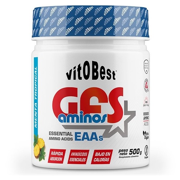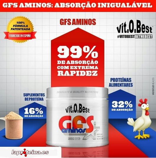GFS Aminos de Vitobest es un suplemento en polvo que contiene una fórmula patentada de aminoácidos esenciales con mapa de absorción genética M.A.P., que son las siglas de patrón maestro de aminoácidos, es decir, la disposición de los 9 aminoácidos esenciales en las cantidades óptimas que perfectamente van a conseguir sustituir la ingesta de una comida proteica.