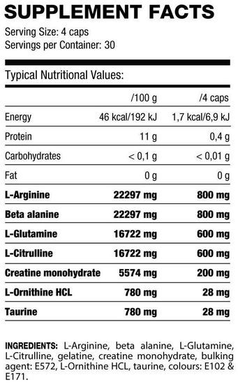 L-arginina, beta alanina, L-glutamina, L-citrulina, gelatina, monohidrato de creatina, agente de carga (E-572), L-ornitina clorhidrato, taurina, colorante (E-102, E-171).