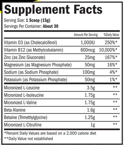 L-Leucina Micronizada, L-isoleucina micronizada, L-valina micronizada, beta alanina, betaína (trimetilglicina), L-citrulina micronizada, vitamina D3 (como colealciferol), vitamina B12 (como metilcobalamina), zinc (como gluconato de zinc), magnesio (como fosfato de magnesio), sodio (como fosfato de sodio), potasio (como fosfato de potasio)