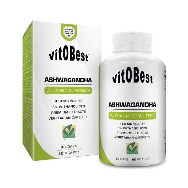 Ashwagandha de Vitobest es un suplemento en cápsulas que proporciona 450 mg de extracto de ashwagandha (Withania somnifera) por dosis de 1 cápsula, estandarizado a un 5% en whitanólidos, a día de hoy la cantidad máxima obtenida para este principio activo.
