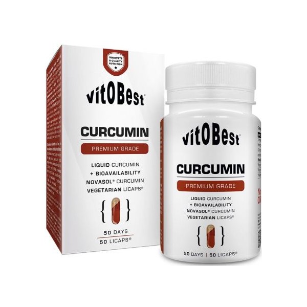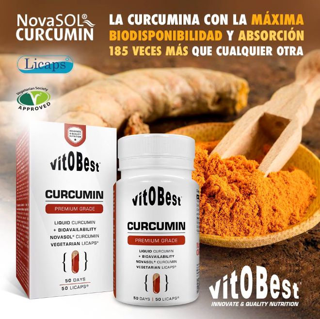 Curcumin de Vitobest® es un suplemento en cápsulas líquidas (Licaps®) que proporciona 500 mg de NovaSOL® Curcumin por cápsula, un compuesto patentado especialmente formulada con la curcumina con mayor biodisponibilidad del mercado y enriquecida con las vitaminas C y D.