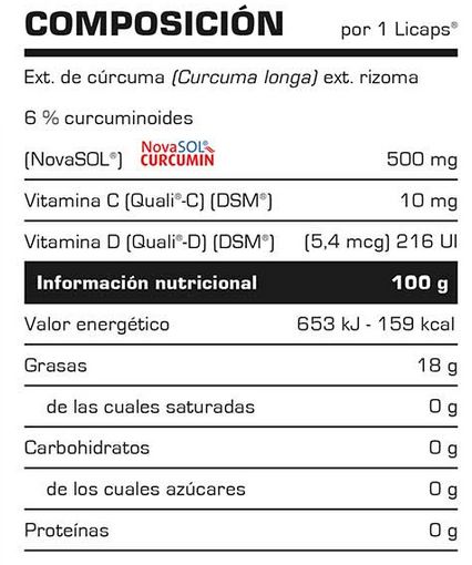 La biodisponibilidad elevada de la cúrcuma de NovaSOL® Curcumin está certificada por estudios científicos (The oral bioavailability of curcumin from micronized powder and liquid micelles is significantly increased in healthy humans and differs between sexes. Christina Schiborr, Alexa Kocher, et al.2014), que aseguran que la fórmula usada de Licaps® se absorbe hasta 185 veces más de media que cualquier otra cúrcuma del mercado.