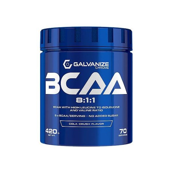 BCAA 8:1:1 brings you three essential Amino Acids (Leucine, Isoleucine, and Valine) in an increased ratio of 8:1:1 to support your body with a higher level of Leucine. These Amino Acids are from the group of essential Amino Acids (accounting for app. 35% of total essential Amino Acids), so-called this, as the body cannot synthetize them. The only source of these come from food or supplements. Galvanize Chrome BCAA 8:1:1 powder offers a high quality amino complex for ambitious and demanding athletes.