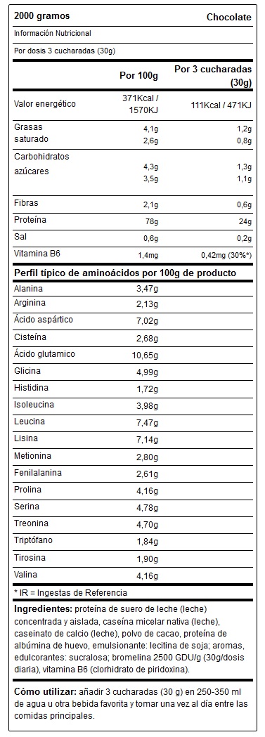 Proteína de suero de leche (leche) concentrada y aislada, caseína micelar nativa (leche), caseinato de calcio (leche), polvo de cacao, proteína de albúmina de huevo, emulsionante: lecitina de soja; aromas, edulcorantes: sucralosa; bromelina 2500 GDU/g (30g/dosis diaria), vitamina B6 (clorhidrato de piridoxina).