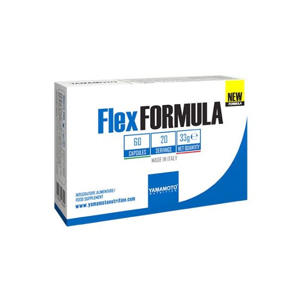 Flex Formula de Yamamoto® Nutrition es un suplemento en cápsulas que contiene una combinación de ChondrActiv™ (colágeno de tipo II, ácido hialurónico y sulfato de condroitina), glucosamina, BosliQ® AKBA (extracto de boswellia) y las vitaminas D y C diseñada principalmente para contribuir a la formación fisiológica del tejido conectivo (manganeso) y para favorecer la funcionalidad articular (Boswellia).