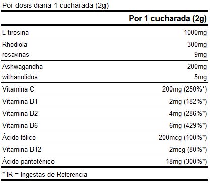 L-tirosina, Rhodiola (Rhodiola rosea L.) raíz extracto seco estandarizado 3% rosavinas, ashwagandha [Withania somnifera (L.) Dunal] raíz extracto seco estandarizado 2,5% conanolidos, ácido L-ascórbico (Vitamina C), regulador de acidez: ácido cítrico, saborizante, espesante: isomalt, nicotinamida (niacina), pantotenato de calcio (ácido pantoténico), edulcorante: sucralosa, antiaglomerante: dióxido de silicio, clorhidrato de piridoxina (vitamina B6), color: carotenos, riboflavina (vitamina B2), clorhidrato de tiamina (vitamina B1), ácido pteroyl-monoglutamico (ácido fólico), cianocobalamina (vitamina B12).