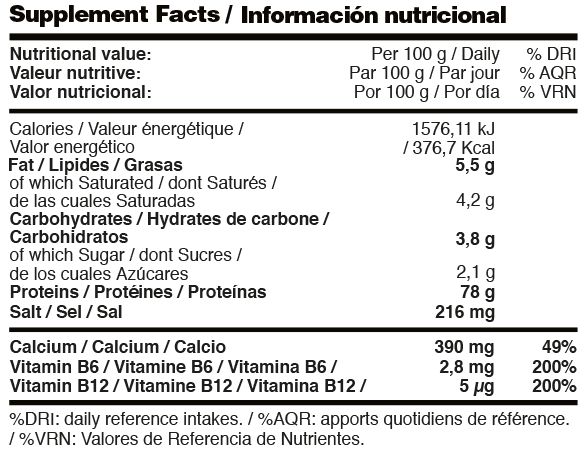 Concentrado de proteína de suero de leche (emulgente lecitina de soja), aislado de proteína de suero de leche (emulgente lecitina de soja), aromas, edulcorante E-955 (sucralosa), complejo multi-enzimático vegetal Digezyme® (amilasa, celulasa, lactasa, lipasa, proteasa), vitamina B6 (piridoxina HCl), vitamina B12 (cianocobalamina).