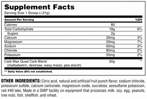 Carb Max Quad Blend (Maltodextrina, Dextrosa, Maíz Ceroso, Almidón de guisante), ácido cítrico, saborizantes naturales y artificiales, cloruro de sodio, sulfato de potasio, carbonato de calcio, óxido de magnesio, sucralosa, acesulfamo de potasio, rojo # 40 lago.