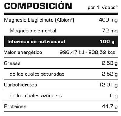 Magnesio bisglicinato (Albion), espesante (cápsula): hidroxipropilmetilcelulosa, agente de carga: celulosa microcristalina, antiaglomerantes: esterato de magnesio y dioxido de sicilio y colorante (cápsula): dioxido de titanio.