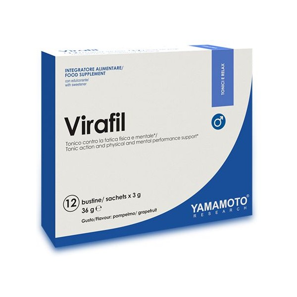 Virafil® de Yamamoto® Nutrition es un suplemento que se presenta en bolsas de 3 gramos que ha sido diseñado para combatir la disfunción erectil a traves de una fórmula que combina la citrullina con varios extractos herbales como la maca, la muira puama, la damiana, el ginkgo biloba y el ginseng coreano, de actividad comprobada y muy utilizados en la medicina tradicional.