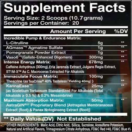 Incredible Pump & Endurance Matrix (L-Citrulline, AGmass Agmatine Sulfate, Pomegranate Powder Extract, Vaso6 (Gallate-Enhanced Oligomers)), Intense Energy Matrix (Caffeine Anhydrous (300mg), Eria Jarensis Extract, Julgans Regia Extract, Stim-X As C. Macroceras Extracted For Alkaloids), Immaculate Focus Matrix (Theacrine (as Tasteless TeaCrine), KannaEase (as Sceletium Tortuosum Standardized For Alkaloids (Total Alkaloids ≥ 0.5%) % 0.2% Mesembrine)), Maximum Absorption Matrix (AstraGIN Proprietary Blend [Astragalus Membranaceus Extract (Root) & Panax Notoginseng Extract (Root)]).