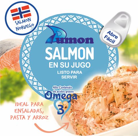 El Salmón en su jugo de Dumon contiene salmón noruego 100% natural en lata y listo para servir, ideal para acompañar ensaladas, pasta y arroz.