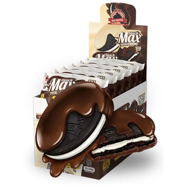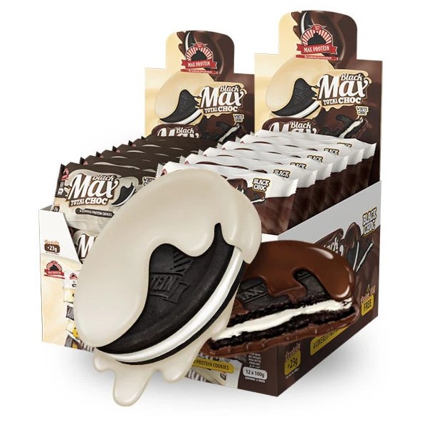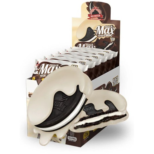 BlackMax TotalChoc de Max Protein son unas deliciosas galletas de chocolate rellenas de crema blanca recubiertas de chocolate blanco o de chocolate negro, altas en proteína, sin grasas hidrogenadas, sin aceite de palma y sin azúcares añadidos, que suponen una fantástica alternativa a las galletas convencionales cargadas de azúcar.