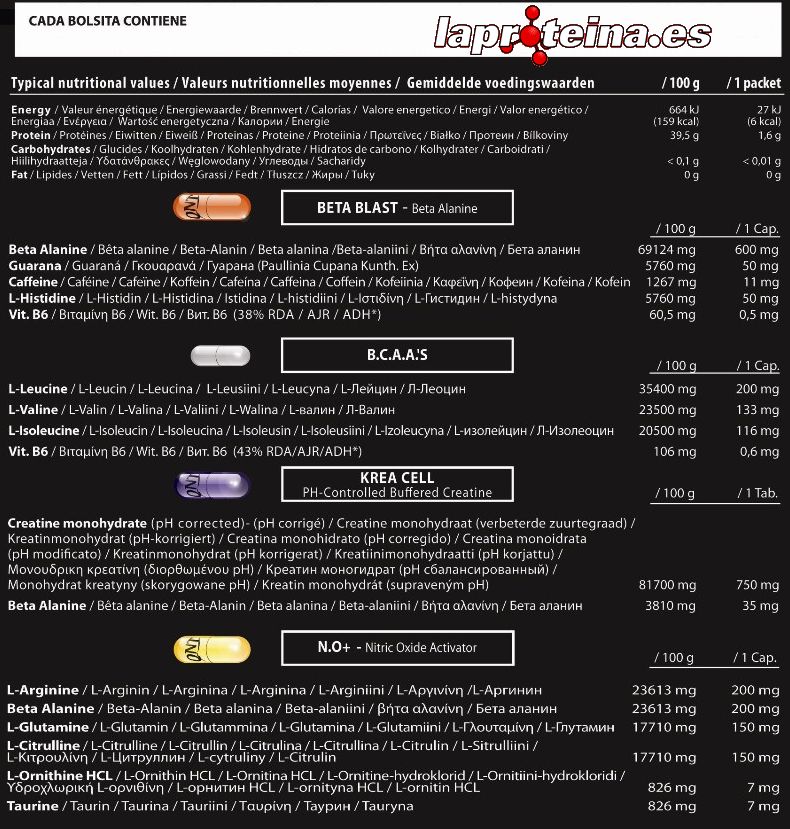 Beta alanine, creatine monohydrate (pH corrected), gelatine, glucosamine sulphate, L-Leucine, chondroïtin sulphate, L-Valine, L-Arginine, L-Isoleucine, L-Citrulline, L-Glutamine, calcium carbonate, bulking agents: E341 & E572; guarana, L-Histidine, magnesium oxide, colours: E122, E131, E102, E172, E110 & E171; L-ornithine HCL, taurine, vit. B6, anti-caking agent E551, vit. D3