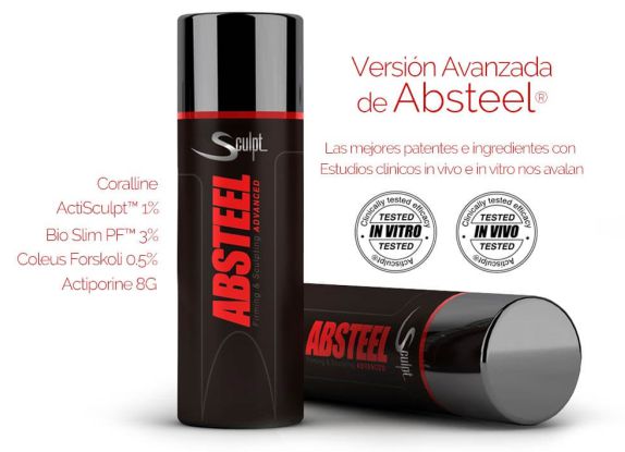 Absteel® Advanced está reforzado con las mejores patentes como Actiporine 8G™, Actisculpt™ y Bio Slim™ así como los mejores ingredientes obtenidos de las últimas investigaciones científicas como Coralline y Glutation.
