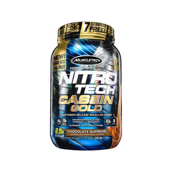 Nitro Tech™ Casein Gold de MuscleTech es un suplemento en polvo que contiene una fórmula proteica de liberación sostenida con caseína micelar, aislado de proteína de leche y caseinato de calcio, tres variantes de la proteína de la leche de alto valor biológico.