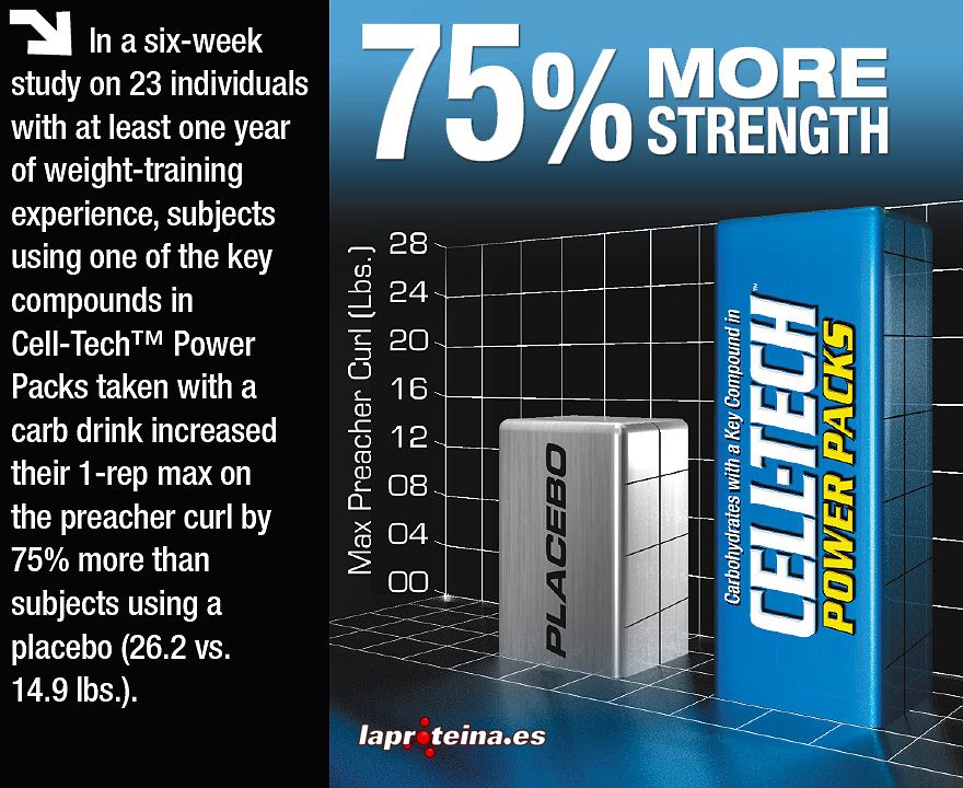 Después de 5 días en un estudio de doble ciego realizado con 16 personas divididas en 3 grupos, se comprobó que el complejo clave de Cell-Tech Power Packs combinado con una bebida de carbohidratos era más eficaz a la hora de llevar creatina a los músculos que 20 gramos de creatina normal en polvo (19 vs. 5,1 mmol • kg-1 dm).
